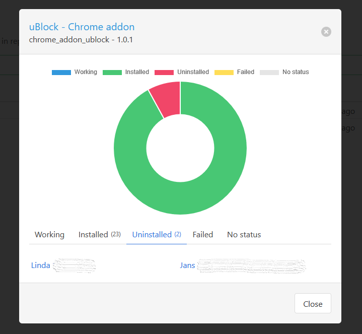 I hope that the stats column is now a little clearer on what is installed and not. The green colour is installed packages, and red is uninstalled, so if the command is uninstall as above, then this means that only 8% of the computers in this group has actually uninstalled this software for both packages in this case.